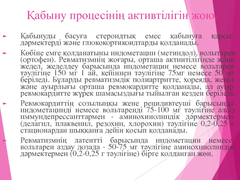 Ревматизмнің жоғары, орташа актинтілігінде және жедел, жеделдеу барысында индометацин немесе вольтарен тәулігіне 150 мг 1 ай, кейіннен тәулігіне 75мг немесе 50 мг беріледі. Бұларды ревматизмдік полиартритте, хореяда, жеңіл және ауырлығы орташа ревмокардитте қолданады, ал ауыр ревмокардитте жүрек шамасыздығы тыйылған кезден беріледі.