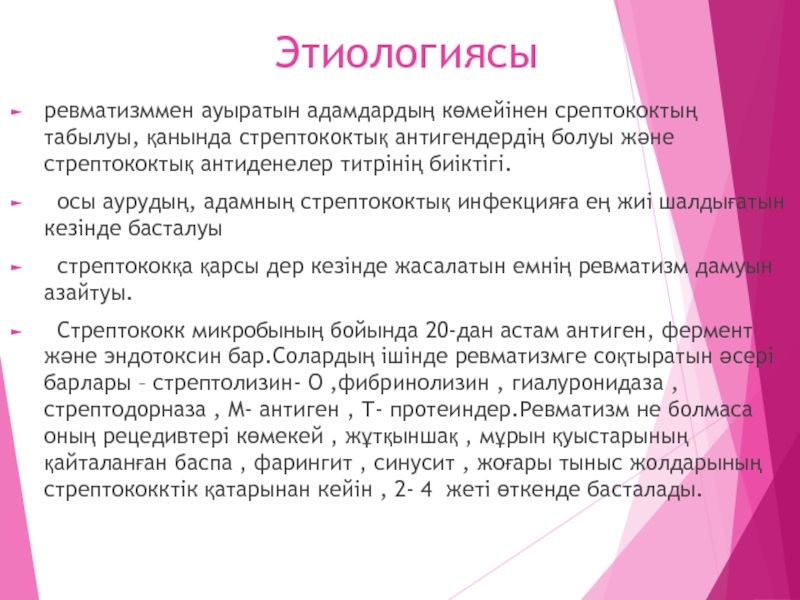 Стрептококк микробының бойында 20-дан астам антиген, фермент және эндотоксин бар.Солардың ішінде ревматизмге соқтыратын әсері барлары – стрептолизин- О ,фибринолизин , гиалуронидаза , стрептодорназа , М- антиген , Т- протеиндер.Ревматизм не болмаса оның рецедивтері көмекей , жұтқыншақ , мұрын қуыстарының қайталанған баспа , фарингит , синусит , жоғары тыныс жолдарының стрептококктік қатарынан кейін , 2- 4 жеті өткенде басталады.
