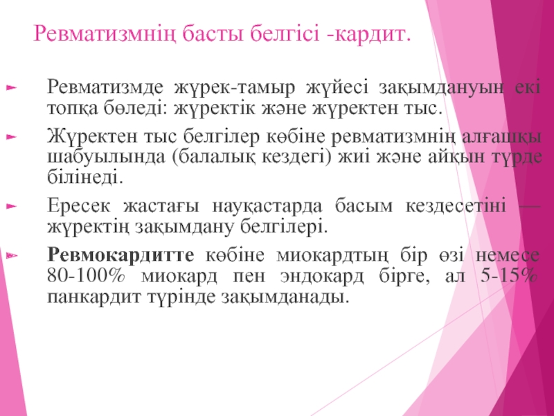 Слайд 19Ревматизмнің басты белгісі -кардит.