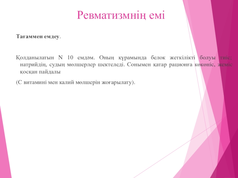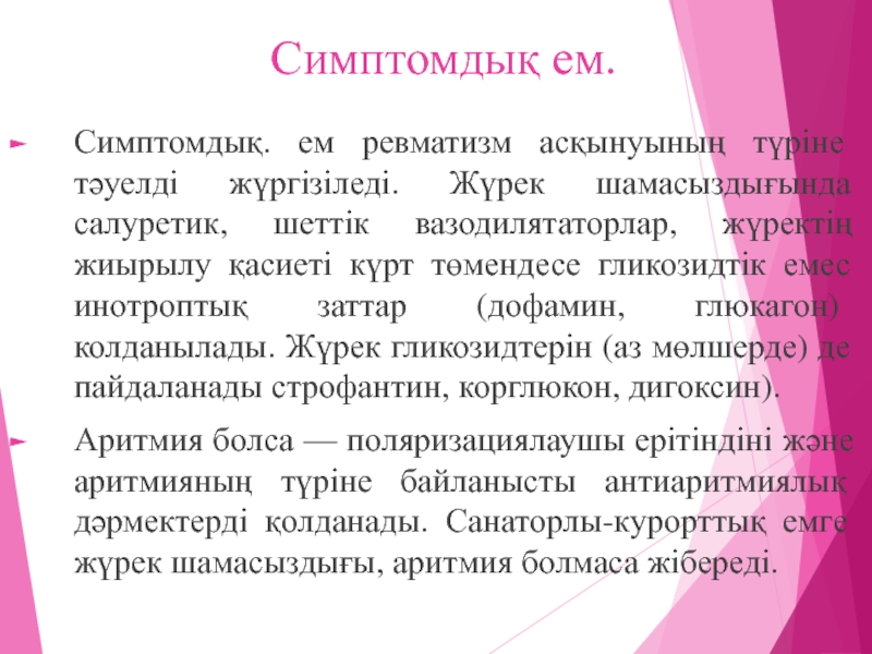 Симптомдық. ем ревматизм асқынуының түріне тәуелді жүргізіледі. Жүрек