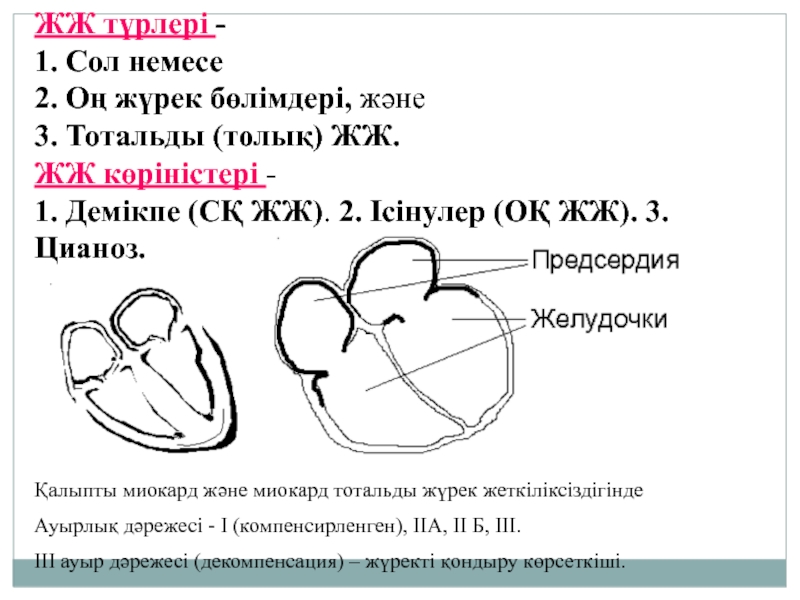 Слайд 12Жүрек жеткіліксіздігі (ЖЖ) – бұл миокардтың жиырылу қызметінің төмендеуі (декомпенсация).