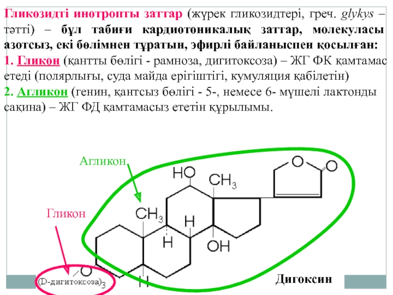 1. Гликон (қантты бөлігі - рамноза, дигитоксоза) – ЖГ ФК қамтамас етеді (полярлығы, суда майда ерігіштігі, кумуляция қабілетін)