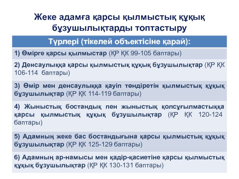 Слайд 2Жеке адамға қарсы қылмыстық құқық бұзушылықтарды топтастыру
