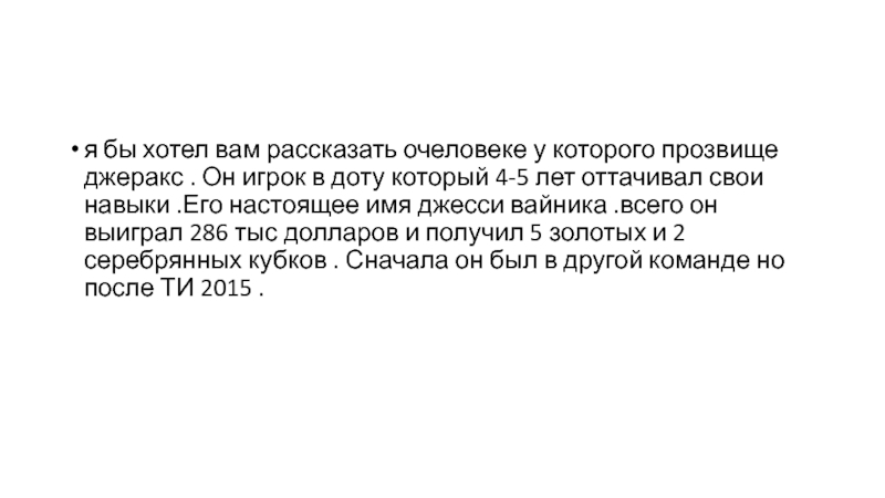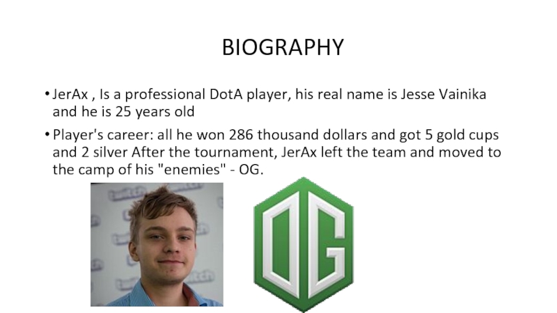 professional DotA player, his real name is Jesse Vainika and he is 25 years old Player's career: all he won 286 thousand dollars and got 5 gold cups and 2 silver After the tournament, JerAx left the team and moved to the camp of his "enemies" - OG.