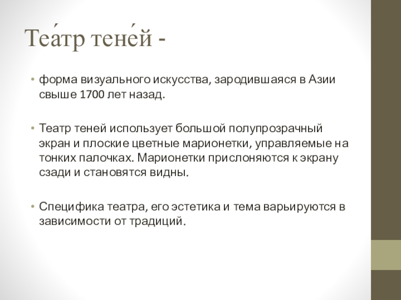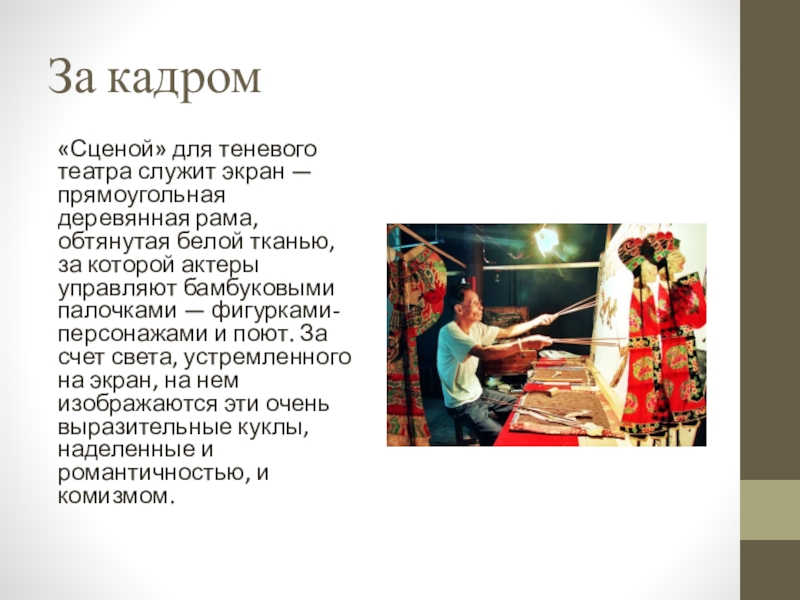 «Сценой» для теневого театра служит экран — прямоугольная деревянная