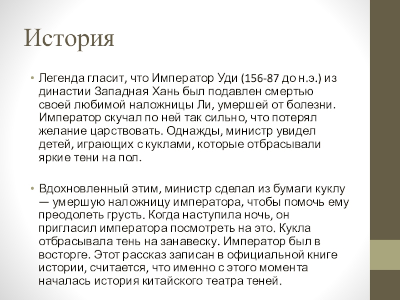 Вдохновленный этим, министр сделал из бумаги куклу — умершую наложницу императора, чтобы помочь ему преодолеть грусть. Когда наступила ночь, он пригласил императора посмотреть на это. Кукла отбрасывала тень на занавеску. Император был в восторге. Этот рассказ записан в официальной книге истории, считается, что именно с этого момента началась история китайского театра теней.