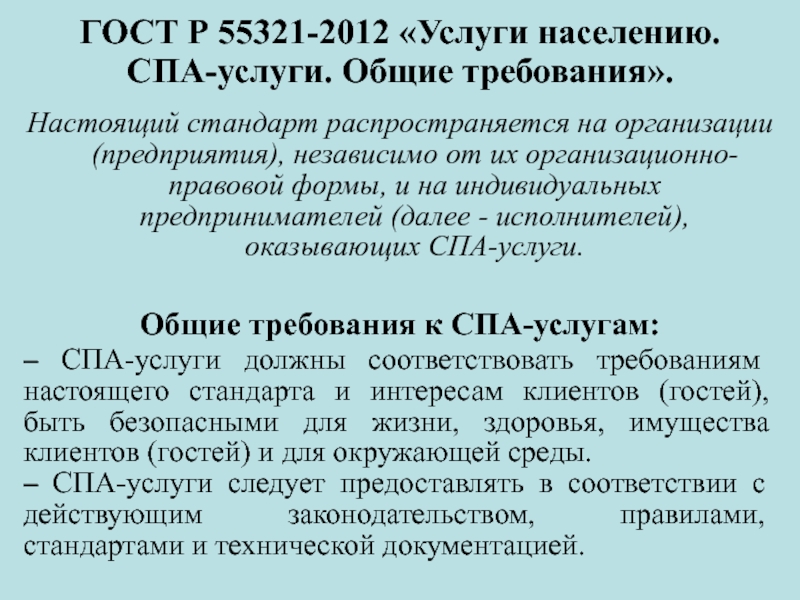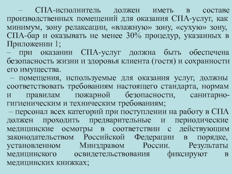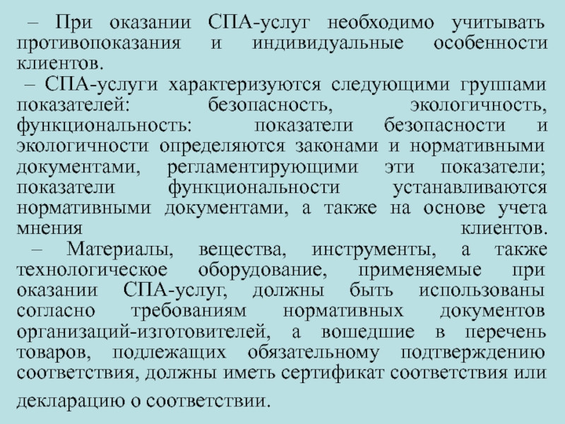 – СПА-услуги следует предоставлять в соответствии с действующим законодательством, правилами, стандартами и технической документацией.