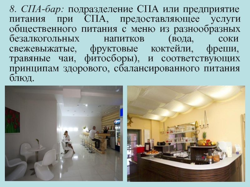 Слайд 258. СПА-бар: подразделение СПА или предприятие питания при СПА, предоставляющее