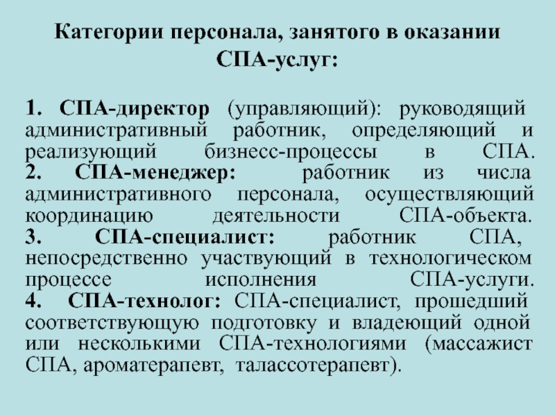 3. СПА-специалист: работник СПА, непосредственно участвующий в технологическом процессе исполнения СПА-услуги.