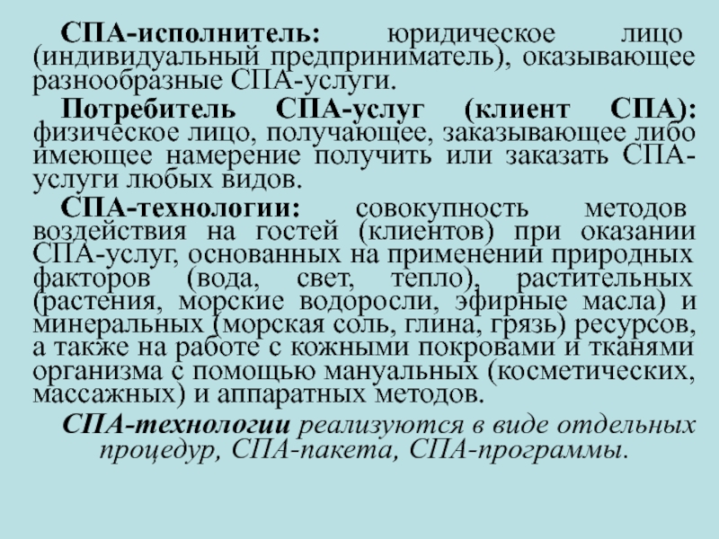 Слайд 4СПА-исполнитель: юридическое лицо (индивидуальный предприниматель), оказывающее разнообразные СПА-услуги.