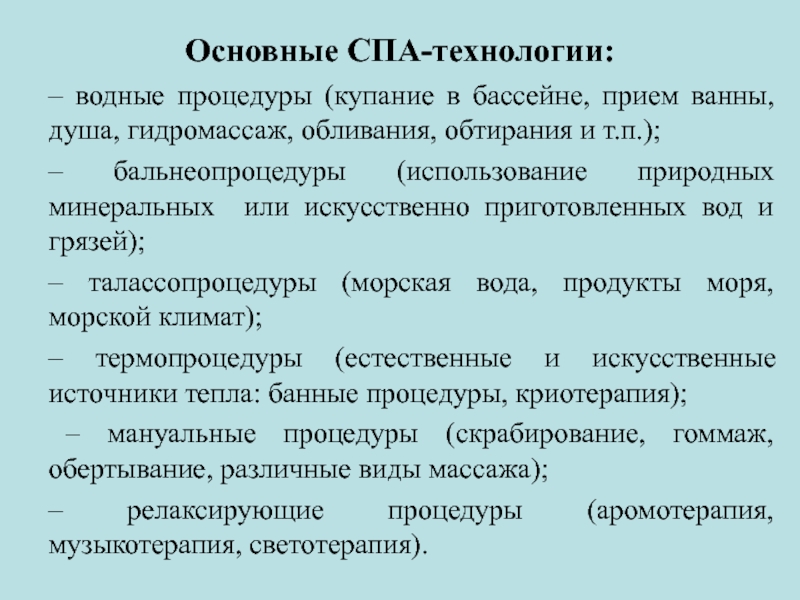 СПА-технологии: совокупность методов воздействия на гостей (клиентов) при оказании СПА-услуг, основанных на применении природных факторов (вода, свет, тепло), растительных (растения, морские водоросли, эфирные масла) и минеральных (морская соль, глина, грязь) ресурсов, а также на работе с кожными покровами и тканями организма с помощью мануальных (косметических, массажных) и аппаратных методов.