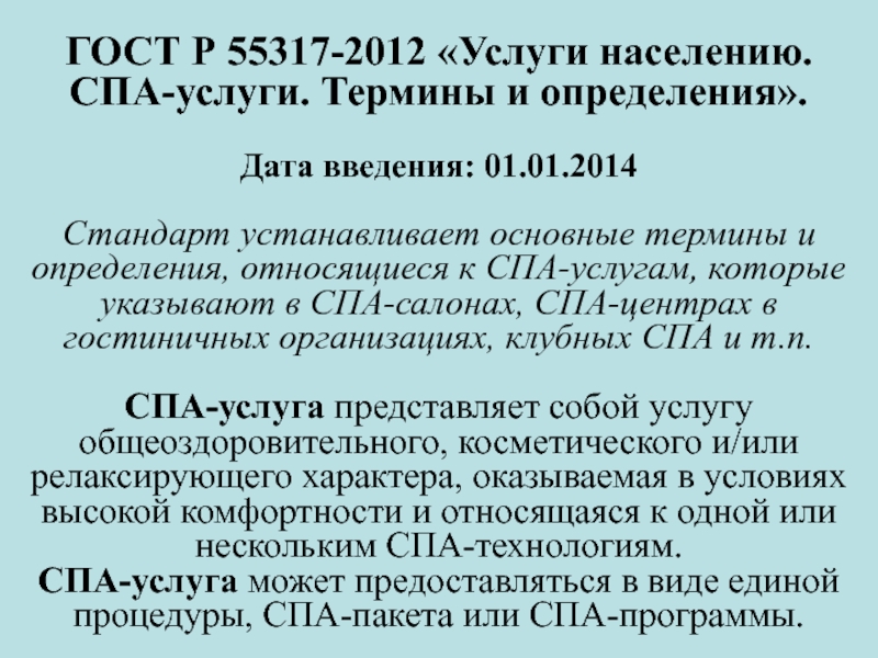 Стандарт устанавливает основные термины и определения, относящиеся к СПА-услугам, которые