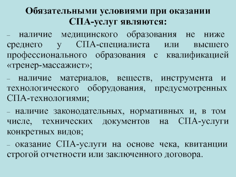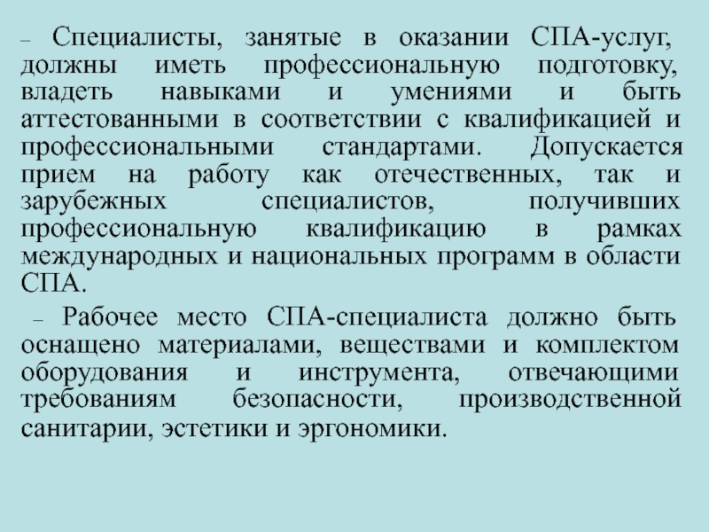 Слайд 32– Специалисты, занятые в оказании СПА-услуг, должны иметь профессиональную подготовку,