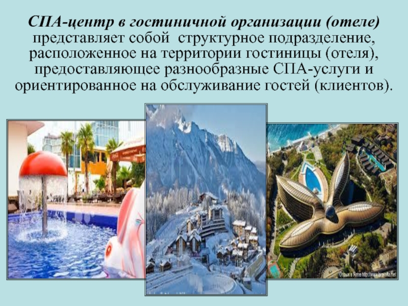 Слайд 7СПА-центр в гостиничной организации (отеле) представляет собой структурное подразделение, расположенное