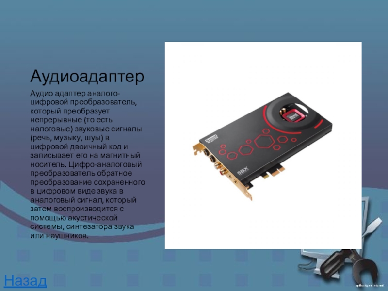 и записывает его на магнитный носитель. Цифро-аналоговый преобразователь обратное преобразование сохраненного в цифровом виде звука в аналоговый сигнал, который затем воспроизводится с помощью акустической системы, синтезатора звука или наушников.Назад