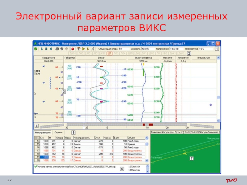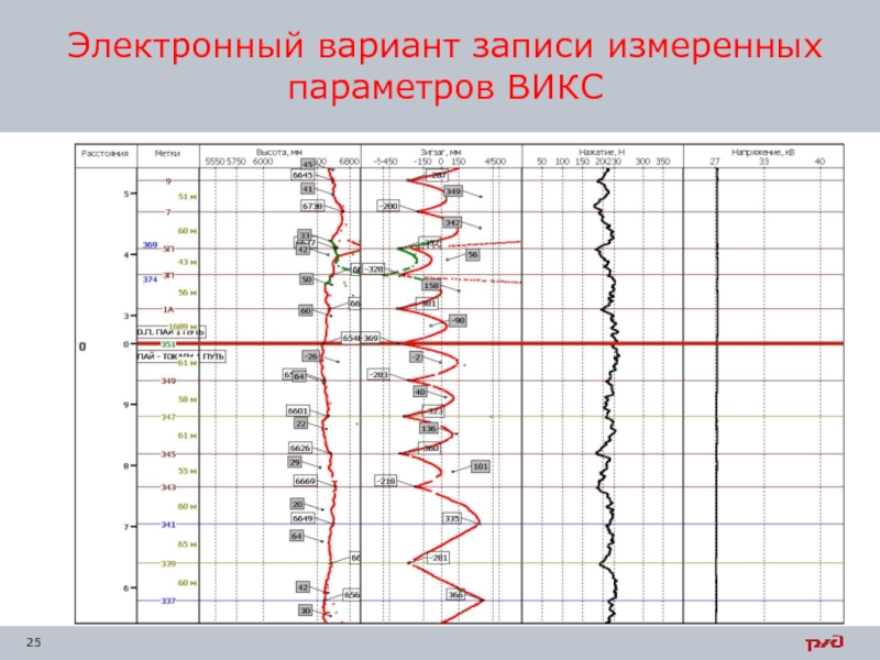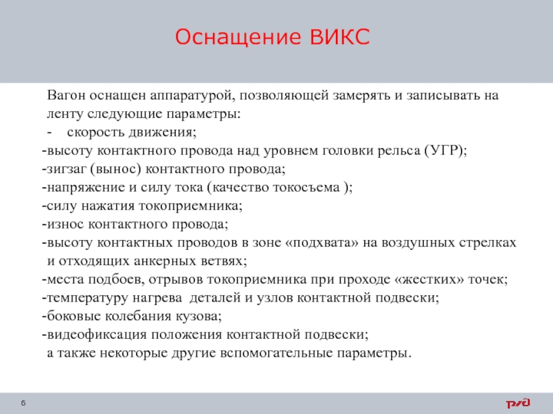 Оснащение ВИКСВагон оснащен аппаратурой, позволяющей замерять и записывать на ленту следующие параметры: -  скорость движения;высоту контактного