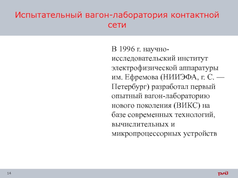 Испытательный вагон-лаборатория контактной сети В 1996 г. научно-исследовательский институт электрофизической аппаратуры им. Ефремова (НИИЭФА, г. С. —