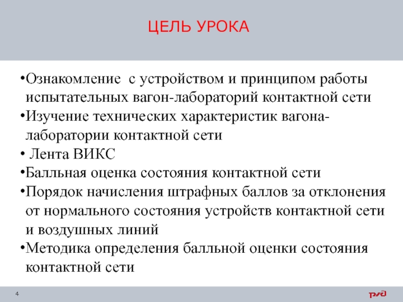 ЦЕЛЬ УРОКА Ознакомление с устройством и принципом работы испытательных вагон-лабораторий контактной сетиИзучение технических характеристик вагона-лаборатории контактной сети