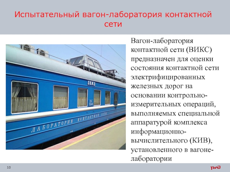 Испытательный вагон-лаборатория контактной сети Вагон-лаборатория контактной сети (ВИКС)предназначен для оценки состояния контактной сети электрифицированных железных дорог на
