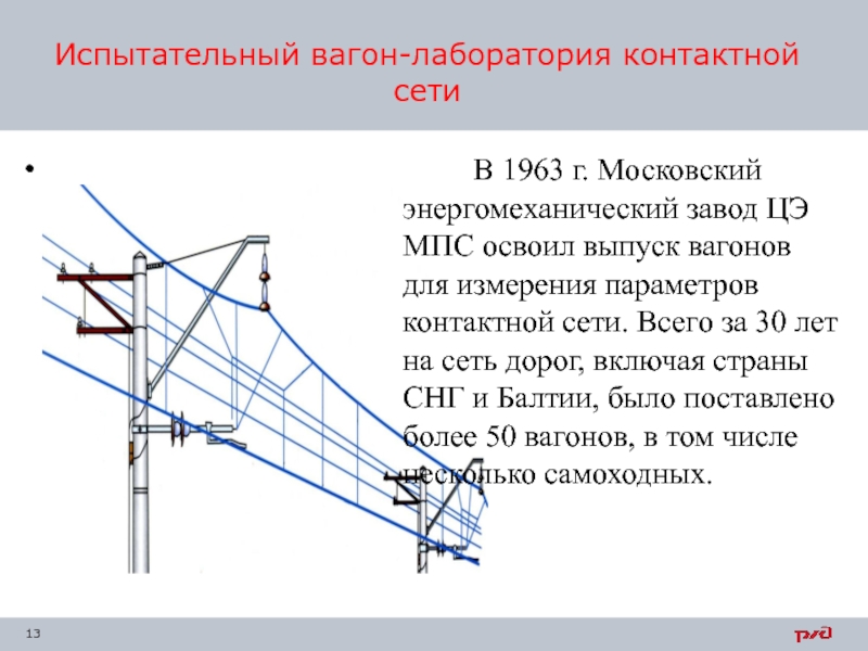 Слайд 13Испытательный вагон-лаборатория контактной сети