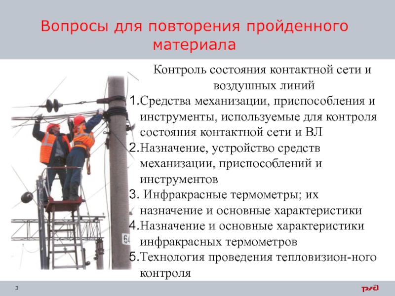 Вопросы для повторения пройденного материалаКонтроль состояния контактной сети и воздушных линийСредства механизации, приспособления и инструменты, используемые для