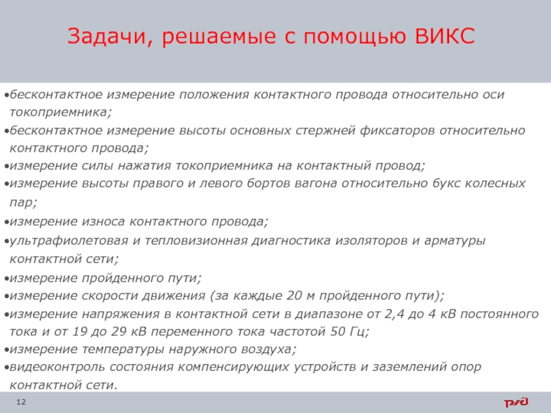 Задачи, решаемые с помощью ВИКСбесконтактное измерение положения контактного провода относительно оси токоприемника;бесконтактное измерение высоты основных стержней фиксаторов