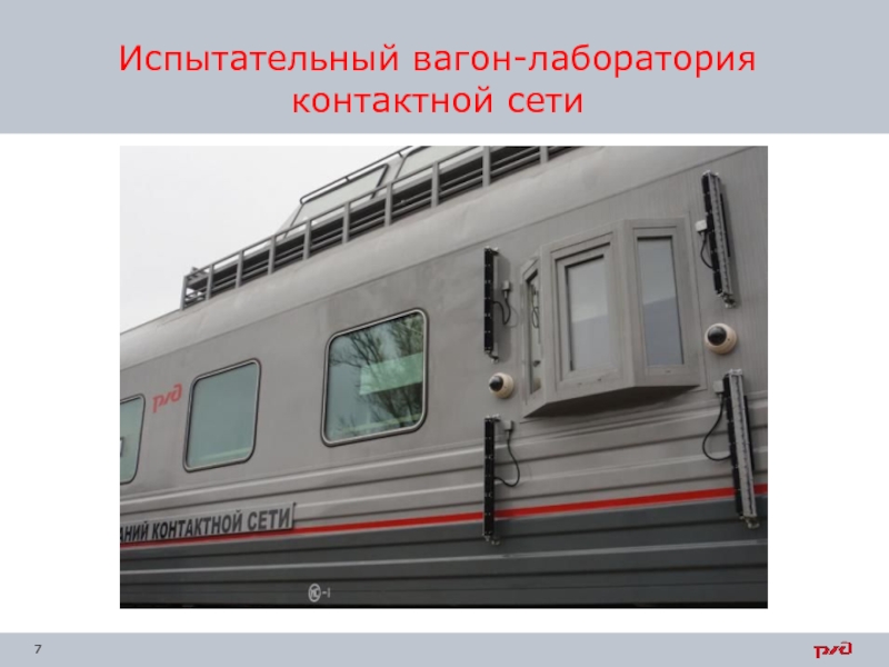 Слайд 7Испытательный вагон-лаборатория контактной сети