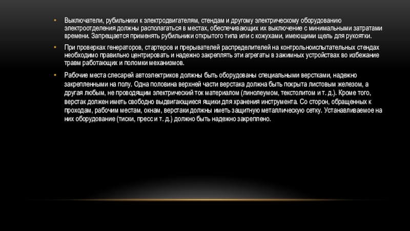 Слайд 6Выключатели, рубильники к электродвигателям, стендам и другому электрическому оборудованию электроотделения