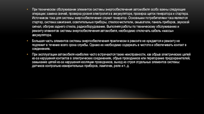 Слайд 7При техническом обслуживании элементов системы энергообеспечения автомобиля особо важны следующие