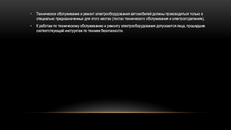 Слайд 2Техническое обслуживание и ремонт электрооборудования автомобилей должны производиться только в