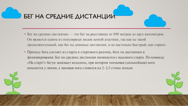Бег на средние дистанцииБег на средние дистанции — это бег на расстояние от 800 метров до двух километров. Он является одним из популярных видов легкой атлетики, так как не такой продолжительный,
