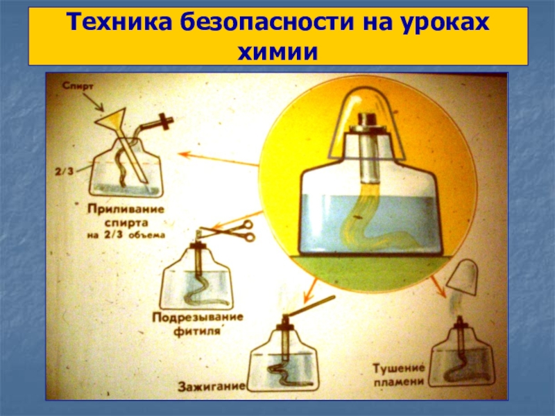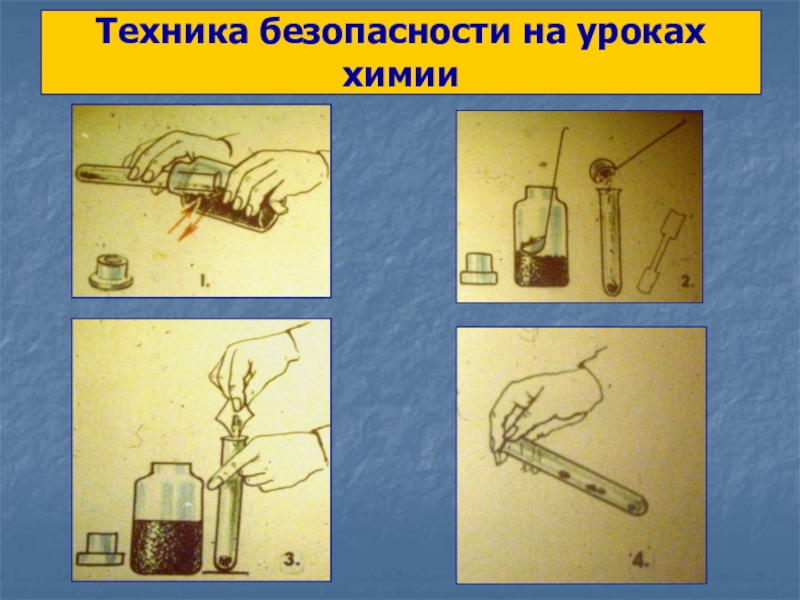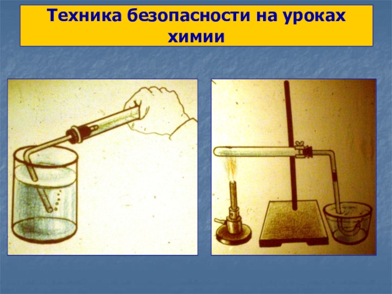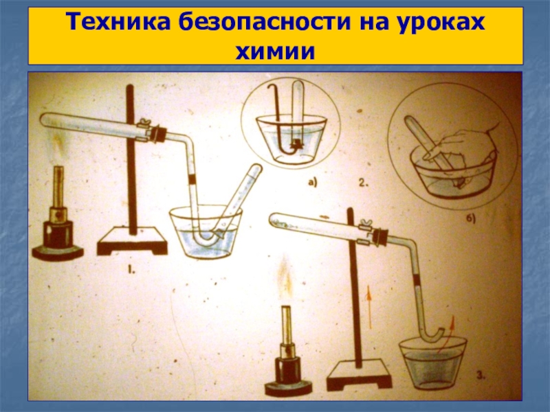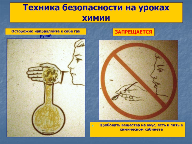 Техника безопасности на уроках химииПробовать вещества на вкус, есть и пить в химическом кабинетеОсторожно направляйте к себе