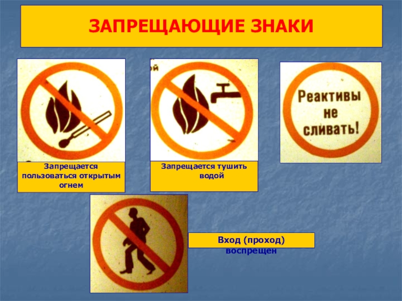 ЗАПРЕЩАЮЩИЕ ЗНАКИЗапрещается тушить водойЗапрещается пользоваться открытым огнемВход (проход) воспрещен