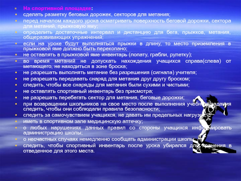 не разрешать перебегать сектор для метания, беговые дорожки;