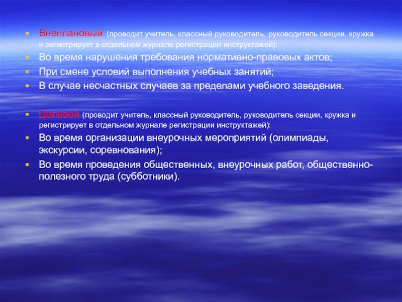 Слайд 13Внеплановый (проводит учитель, классный руководитель, руководитель секции, кружка и регистрирует