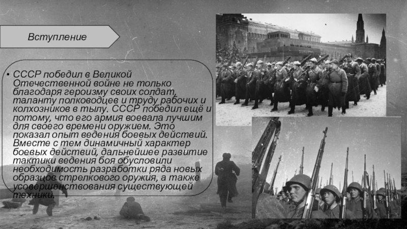 тылу. СССР победил ещё и потому, что его армия воевала лучшим для своего времени оружием. Это показал опыт ведения боевых действий. Вместе с тем динамичный характер боевых действий, дальнейшее развитие тактики ведения боя обусловили необходимость разработки ряда новых образцов стрелкового оружия, а также усовершенствования существующей техники.