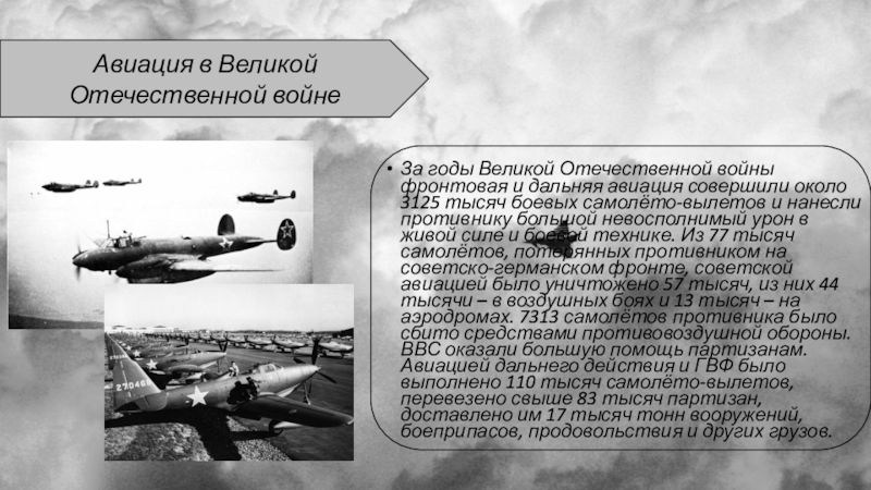 урон в живой силе и боевой технике. Из 77 тысяч самолётов, потерянных противником на советско-германском фронте, советской авиацией было уничтожено 57 тысяч, из них 44 тысячи – в воздушных боях и 13 тысяч – на аэродромах. 7313 самолётов противника было сбито средствами противовоздушной обороны. ВВС оказали большую помощь партизанам. Авиацией дальнего действия и ГВФ было выполнено 110 тысяч самолёто-вылетов, перевезено свыше 83 тысяч партизан, доставлено им 17 тысяч тонн вооружений, боеприпасов, продовольствия и других грузов.