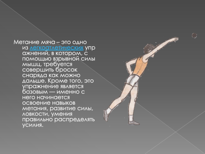 Слайд 2Метание мяча – это одно из легкоатлетических упражнений, в котором, с помощью