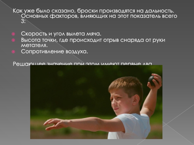 Слайд 5Как уже было сказано, броски производятся на дальность. Основных факторов,