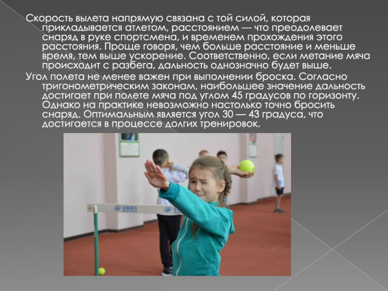 Слайд 6Скорость вылета напрямую связана с той силой, которая прикладывается атлетом,