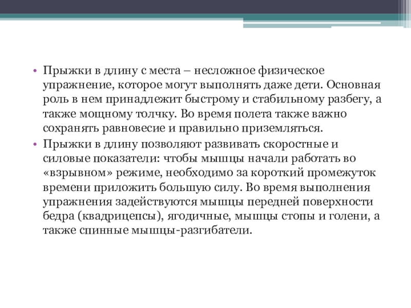 Слайд 2Прыжки в длину с места – несложное физическое упражнение, которое