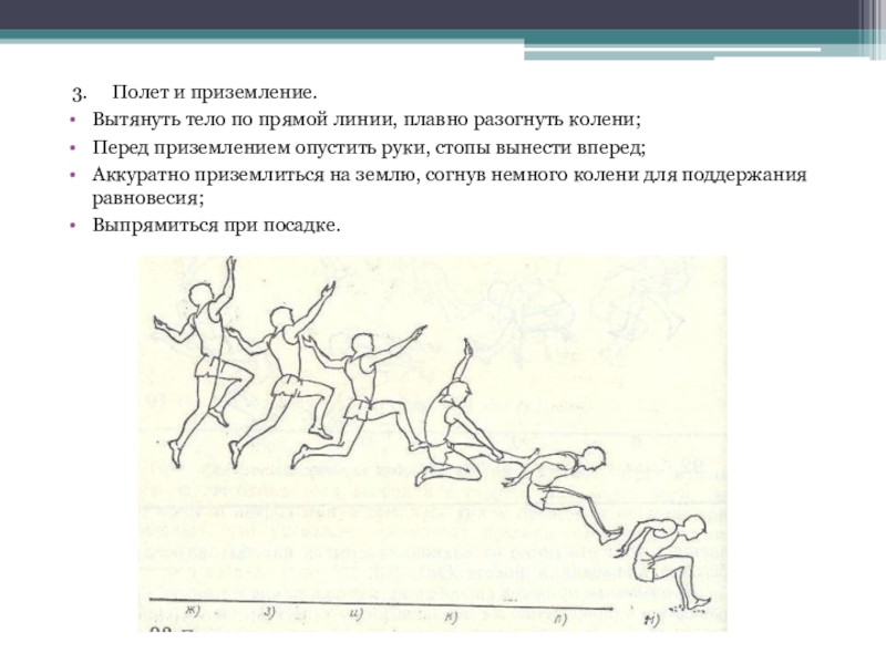 3.     Полет и приземление. Вытянуть тело по прямой линии, плавно разогнуть колени;Перед приземлением опустить руки, стопы
