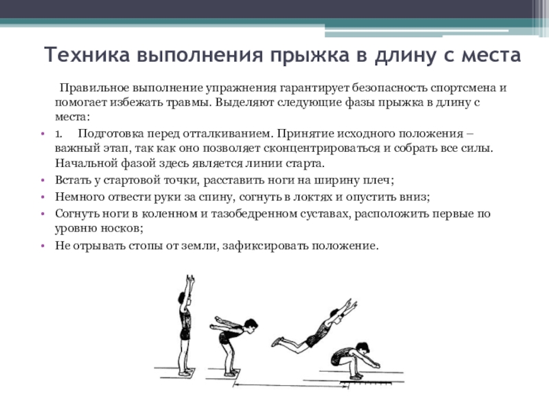 Техника выполнения прыжка в длину с места     Правильное выполнение упражнения гарантирует безопасность спортсмена