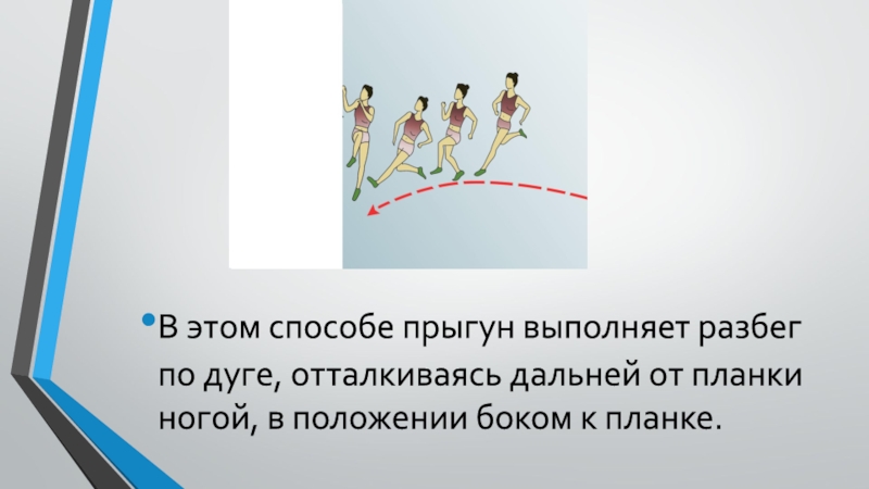 Слайд 4В этом способе прыгун выполняет разбег по дуге, отталкиваясь дальней