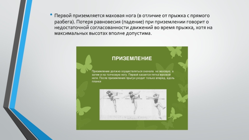 Слайд 8Первой приземляется маховая нога (в отличие от прыжка с прямого
