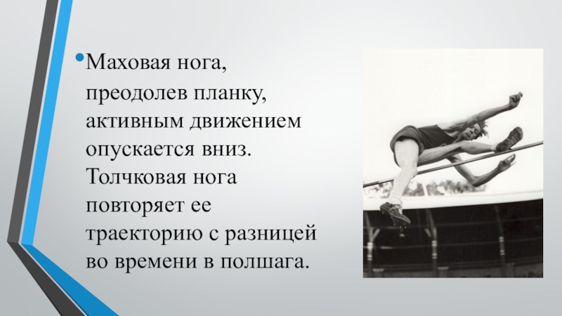 Слайд 6Маховая нога, преодолев планку, активным движением опускается вниз. Толчковая нога