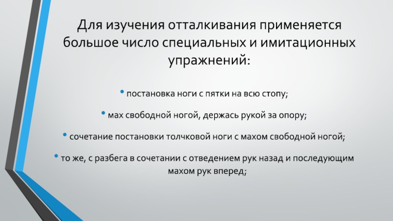 Для изучения отталкивания применяется большое число специальных и имитационных упражнений: постановка ноги с пятки на всю стопу;мах