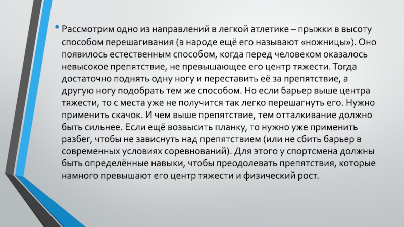 Рассмотрим одно из направлений в легкой атлетике – прыжки в высоту способом перешагивания (в народе ещё его называют «ножницы»). Оно появилось естественным способом, когда перед человеком оказалось невысокое препятствие, не превышающее