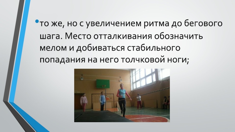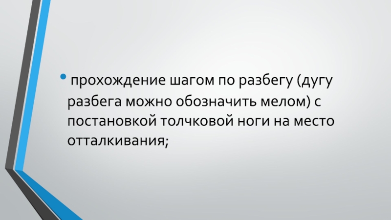 Слайд 10 прохождение шагом по разбегу (дугу разбега можно обозначить мелом)