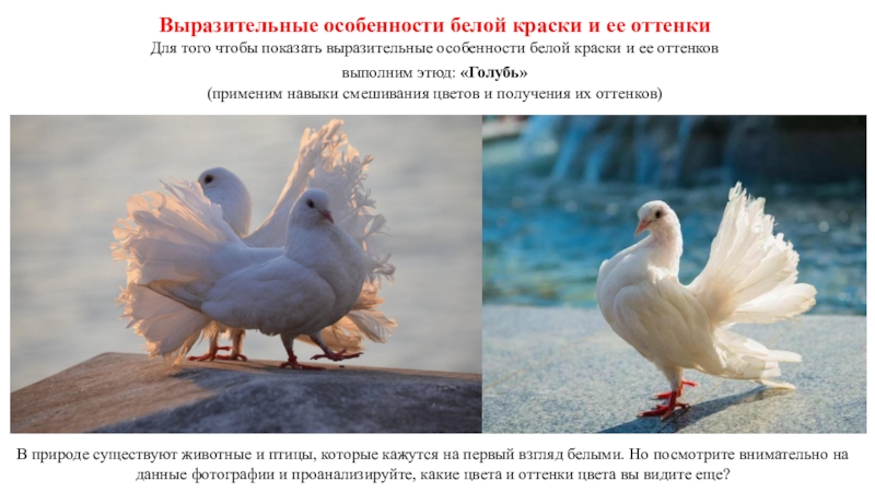 В природе существуют животные и птицы, которые кажутся на первый взгляд белыми. Но посмотрите внимательно на данные фотографии и проанализируйте, какие цвета и оттенки цвета вы видите еще?
